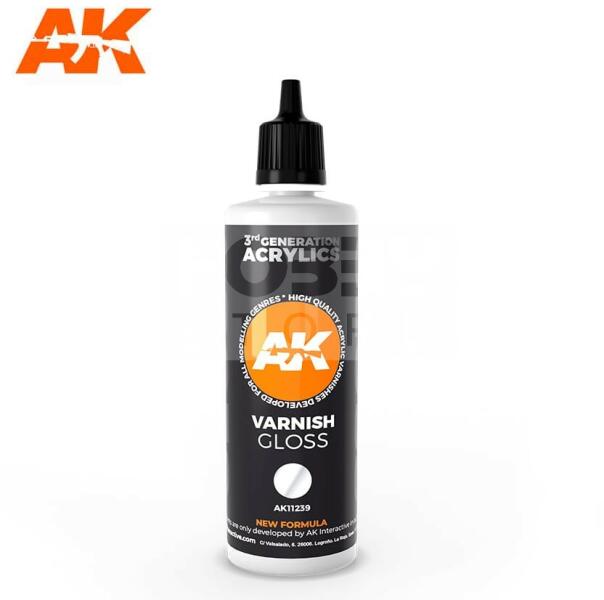 AK-Interactive - 3rd Generation Gloss Varnish 100 ml - fényes lakk AK11239 Fényes lakk. Új formulával készült kiváló minőségű akrilfesték modellezéshez-makettezéshez. Új összetevőinek köszönhetően a festék szerkezete nem esik szét, ezzel elkerülhetjük a termék állása utáni hosszadalmas felrázási folyamatot. Kiválóan alkalmas ecsettel és airbrush-al történő alkalmazásra is, utóbbi esetében megfelelő hígítással(lehetőleg saját hígítójával). Az új AK-Interactive 3. generációs akrilfesték formula 2X jobb tapadási tulajdonsággal van felvértezve. Száradás után ellenállóak, kiválóan koszolhatóak akár akril akár enamel (olajbázisú) termékekkel is. Előnyök:
