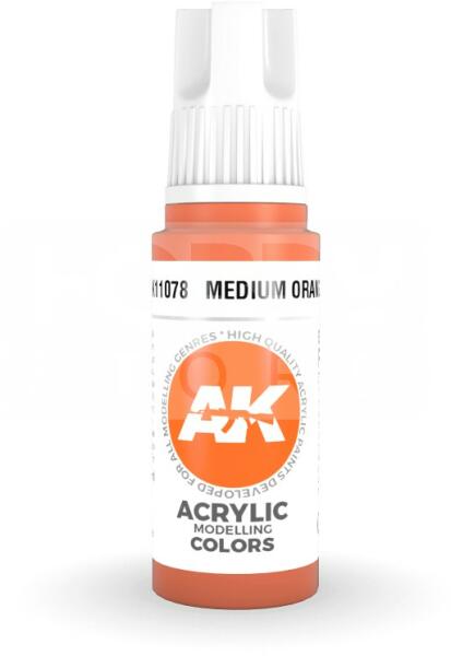 AK-Interactive - Acrylics 3rd generation Medium Orange 17ml - akrilfesték AK11078 Új formulával készült kiváló minőségű akrilfesték modellezéshez-makettezéshez. Új összetevőinek köszönhetően a festék szerkezete nem esik szét, ezzel elkerülhetjük a termék állása utáni hosszadalmas felrázási folyamatot. Kiválóan alkalmas ecsettel és airbrush-al történő alkalmazásra is, utóbbi esetében megfelelő hígítással(lehetőleg saját hígítójával). Az új AK-Interactive 3. generációs akrilfesték formula 2X jobb tapadási tulajdonsággal van felvértezve. Száradás után ellenállóak, kiválóan koszolhatóak akár akril akár enamel (olajbázisú) termékekkel is. Előnyök: