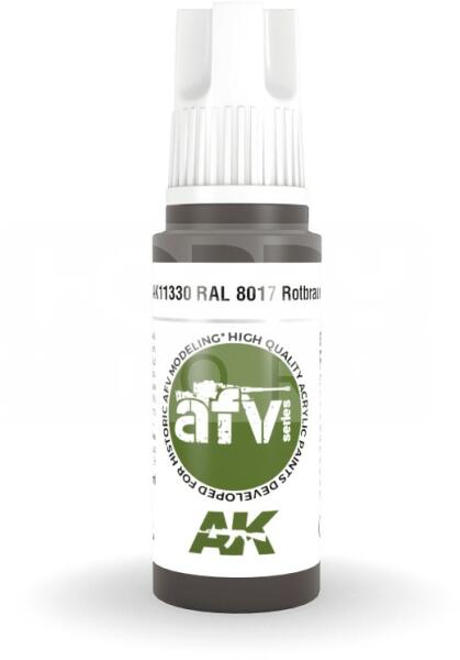 AK-Interactive - Acrylics 3rd generation RAL 8017 Rotbraun - akrilfesték AK11330 Új formulával készült kiváló minőségű akrilfesték modellezéshez-makettezéshez. Új összetevőinek köszönhetően a festék szerkezete nem esik szét, ezzel elkerülhetjük a termék állása utáni hosszadalmas felrázási folyamatot. Kiválóan alkalmas ecsettel és airbrush-al történő alkalmazásra is, utóbbi esetében megfelelő hígítással(lehetőleg saját hígítójával). Az új AK-Interactive 3. generációs akrilfesték formula 2X jobb tapadási tulajdonsággal van felvértezve. Száradás után ellenállóak, kiválóan koszolhatóak akár akril akár enamel (olajbázisú) termékekkel is. Előnyök: