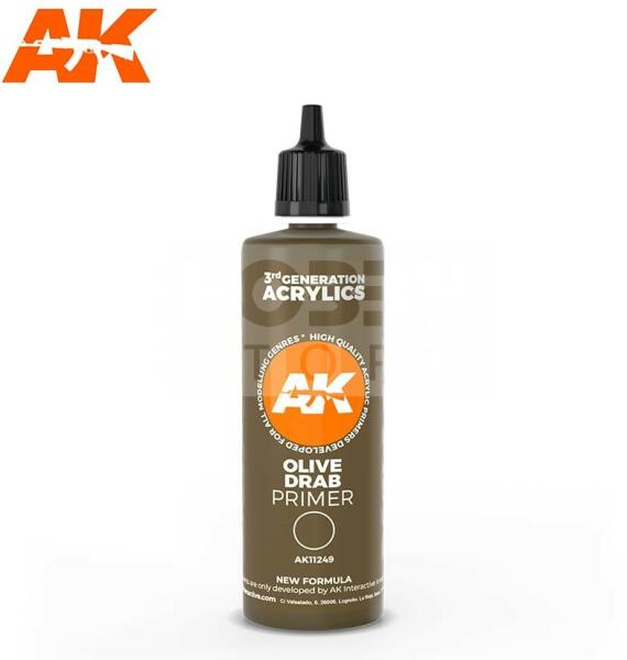 AK-Interactive - Olive drab surface primer 100Ml - alapozó akrilfesték AK11249 Alapozó akrilfesték modellezéshez makettezéshez. Új formulával készült kiváló minőségű akrilfesték modellezéshez-makettezéshez. Új összetevőinek köszönhetően a festék szerkezete nem esik szét, ezzel elkerülhetjük a termék állása utáni hosszadalmas felrázási folyamatot. Kiválóan alkalmas ecsettel és airbrush-al történő alkalmazásra is, utóbbi esetében megfelelő hígítással(lehetőleg saját hígítójával). Az új AK-Interactive 3. generációs akrilfesték formula 2X jobb tapadási tulajdonsággal van felvértezve. Száradás után ellenállóak, kiválóan koszolhatóak akár akril akár enamel (olajbázisú) termékekkel is. Előnyök: