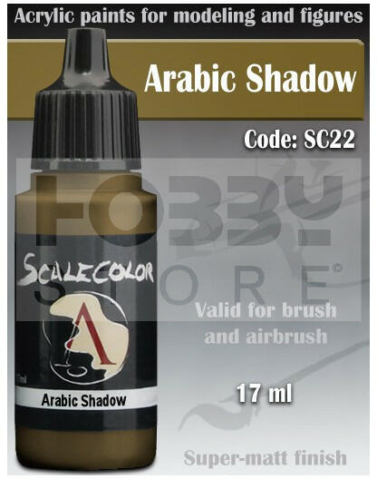 Scale75 - SCALECOLOR Range - ARABIC SHADOW akrilfesték 17ml SC-22 Akrilfesték modellezőknek és wargamesek számára. Magas pigment tartalmú rendkívül jól fedő és használahtó ultra mattra száradó festék. A Scale75 Scalecolor széria elsősorban figura festők és társasjáték figura festők számára készült. A 63 színből álló paletta rendkívül élénk színeivel nagyszerű végeredményeket érhetünk el figuráinkon. A termék felrázás után azonal használható ecsettel, további hígítás után pedig aribrush-al. Előnyök: