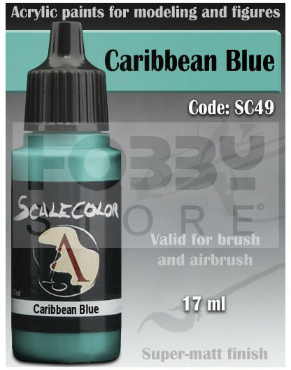 Scale75 - SCALECOLOR Range - CARIBBEAN BLUE akrilfesték 17ml SC-49 Akrilfesték modellezőknek és wargamesek számára. Magas pigment tartalmú rendkívül jól fedő és használahtó ultra mattra száradó festék. A Scale75 Scalecolor széria elsősorban figura festők és társasjáték figura festők számára készült. A 63 színből álló paletta rendkívül élénk színeivel nagyszerű végeredményeket érhetünk el figuráinkon. A termék felrázás után azonal használható ecsettel, további hígítás után pedig aribrush-al. Előnyök: