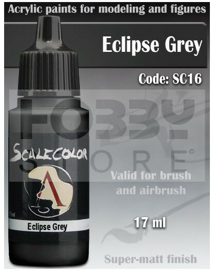 Scale75 - SCALECOLOR Range - ECLIPSE GREY akrilfesték 17ml SC-16 Akrilfesték modellezőknek és wargamesek számára. Magas pigment tartalmú rendkívül jól fedő és használahtó ultra mattra száradó festék. A Scale75 Scalecolor széria elsősorban figura festők és társasjáték figura festők számára készült. A 63 színből álló paletta rendkívül élénk színeivel nagyszerű végeredményeket érhetünk el figuráinkon. A termék felrázás után azonal használható ecsettel, további hígítás után pedig aribrush-al. Előnyök: