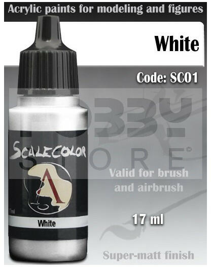 Scale75 - SCALECOLOR Range - WHITE akrilfesték 17ml SC-01 Akrilfesték modellezőknek és wargamesek számára. Magas pigment tartalmú rendkívül jól fedő és használahtó ultra mattra száradó festék. A Scale75 Scalecolor széria elsősorban figura festők és társasjáték figura festők számára készült. A 63 színből álló paletta rendkívül élénk színeivel nagyszerű végeredményeket érhetünk el figuráinkon. A termék felrázás után azonal használható ecsettel, további hígítás után pedig aribrush-al. Előnyök: