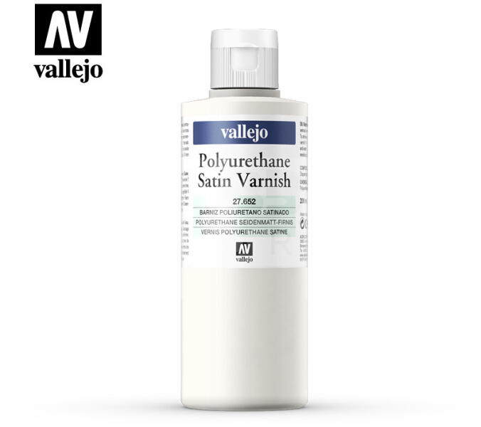 Vallejo Polyurethane Satin Varnish 200 ml - Poliuretán félfényes lakk 27652 A Vallejo Poliuretán lakk gyors száradású és rendkívül jó keménységű vízbázisú félfényes akril lakk. Megvédi a festett modelleket maketteket a karcolásoktól, szennyeződésektől és nedvességtől. UV álló. Felhordható ecsettel, lakkozó ecsettel vagy megfelelő hígítás után szórópisztollyal. Két rétegben érdemes alkalmazni, a rétegek közt hagyjunk minimum 4 óra száradási időt Használat után a szerszámokat (ecseteket. . ) vízzel mossuk el. Kiválóan alkalmas miniatűr modellek makettek és figurák festésére kis és nagy felületen egyaránt. Felhasználási területek:
